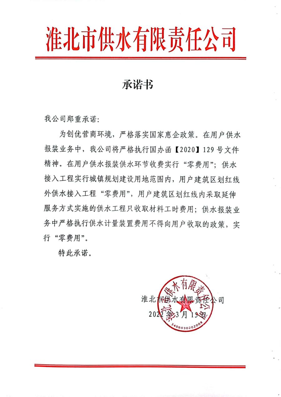 淮北市供水有限責任公司紅線外“零費用”承諾書