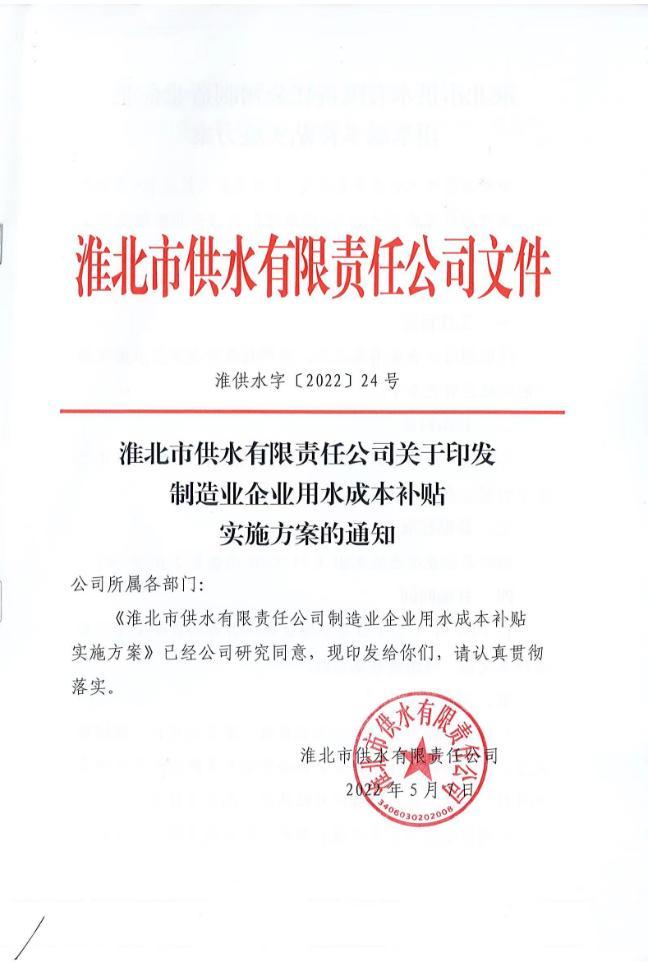 淮北市供水有限責任公司關于印發制造業企業用水成本補貼實施方案的通知 淮供水字【2022】24號