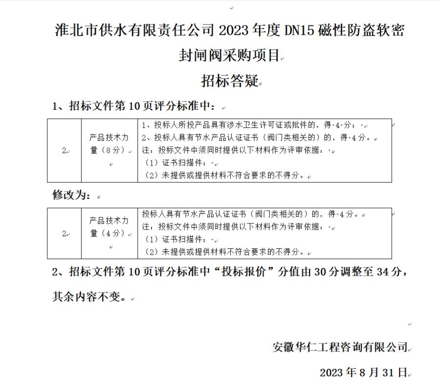 淮北市供水有限責任公司2023年度DN15磁性防盜軟密封閘閥采購項目招標答疑