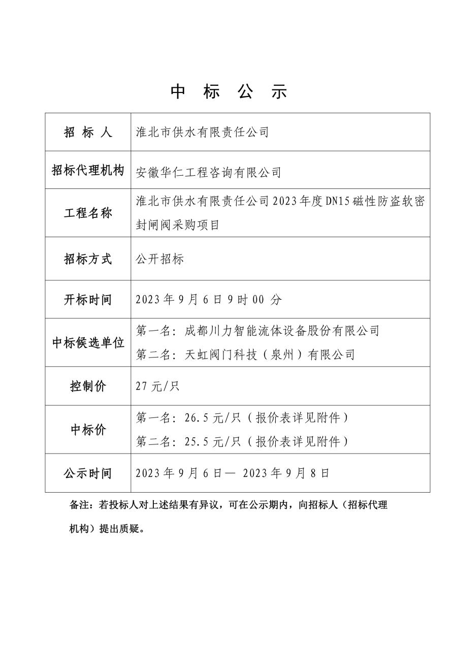 中標(biāo)公示:淮北市供水有限責(zé)任公司2023年度DN15磁性防盜軟密封閘閥采購項(xiàng)目