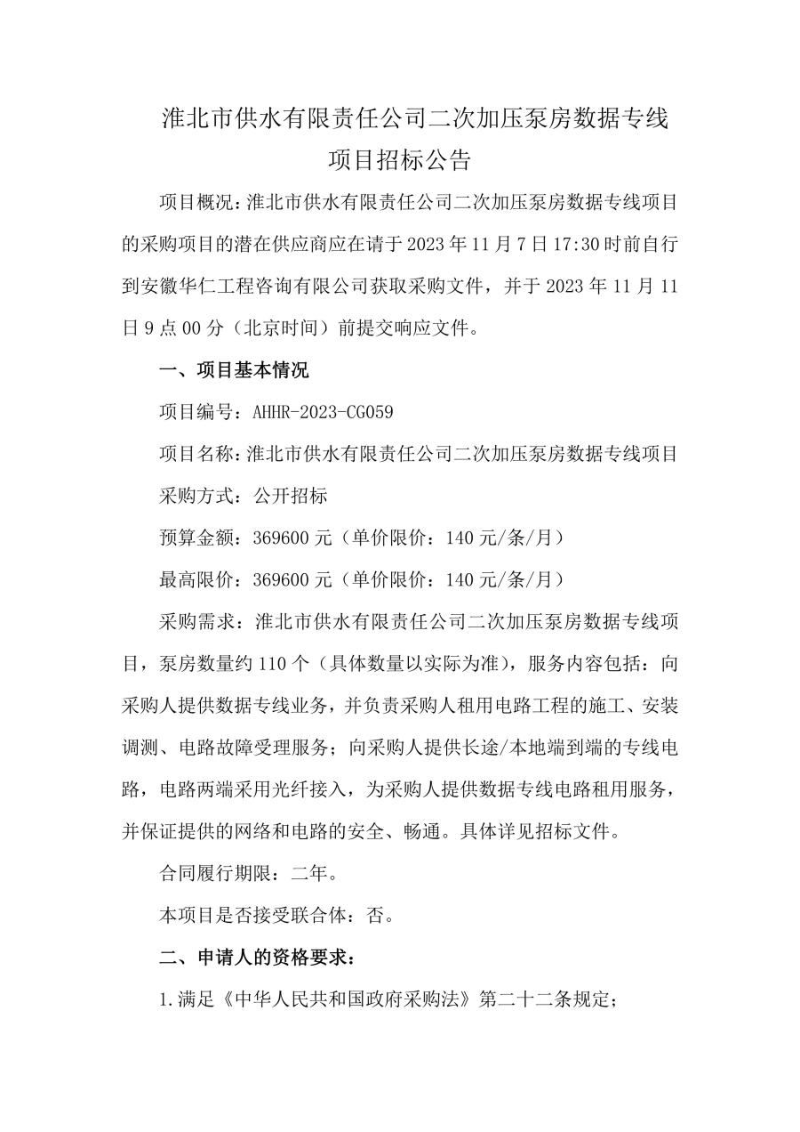 淮北市供水有限責(zé)任公司二次加壓泵房數(shù)據(jù)專(zhuān)線(xiàn)項(xiàng)目招標(biāo)公告
