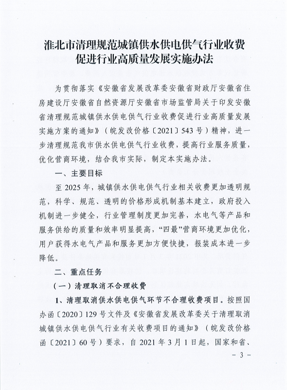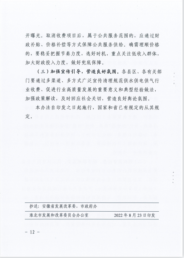 關(guān)于印發(fā)淮北市清理規(guī)范城鎮(zhèn)供水供電供氣行業(yè)收費(fèi)促進(jìn)行業(yè)高質(zhì)量發(fā)展實(shí)施辦法的通知 淮發(fā)改價(jià)費(fèi)[2022]248號(hào)